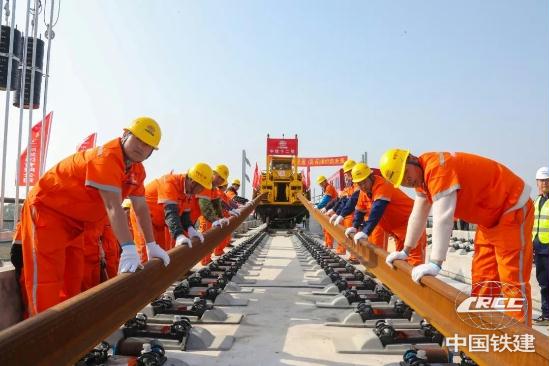 為優(yōu)質(zhì)高效完成全線鋪軌任務(wù),建設(shè)者提前在位于荊州站北側(cè)的鋪軌基地儲存長鋼軌,以鋪軌基地為起點,采用TC-500型鋪軌機由荊州站一路向北鋪設(shè)長鋼軌;加持智能行車調(diào)度指揮系統(tǒng),全天候?qū)︿佨墮C、長軌運輸車、焊軌車等設(shè)備的運行狀態(tài)及作業(yè)位置進行監(jiān)控和統(tǒng)一調(diào)度指揮,保證了交叉施工安全有序,并且提高了鋪軌速度,每日單向鋪軌可達6公里。